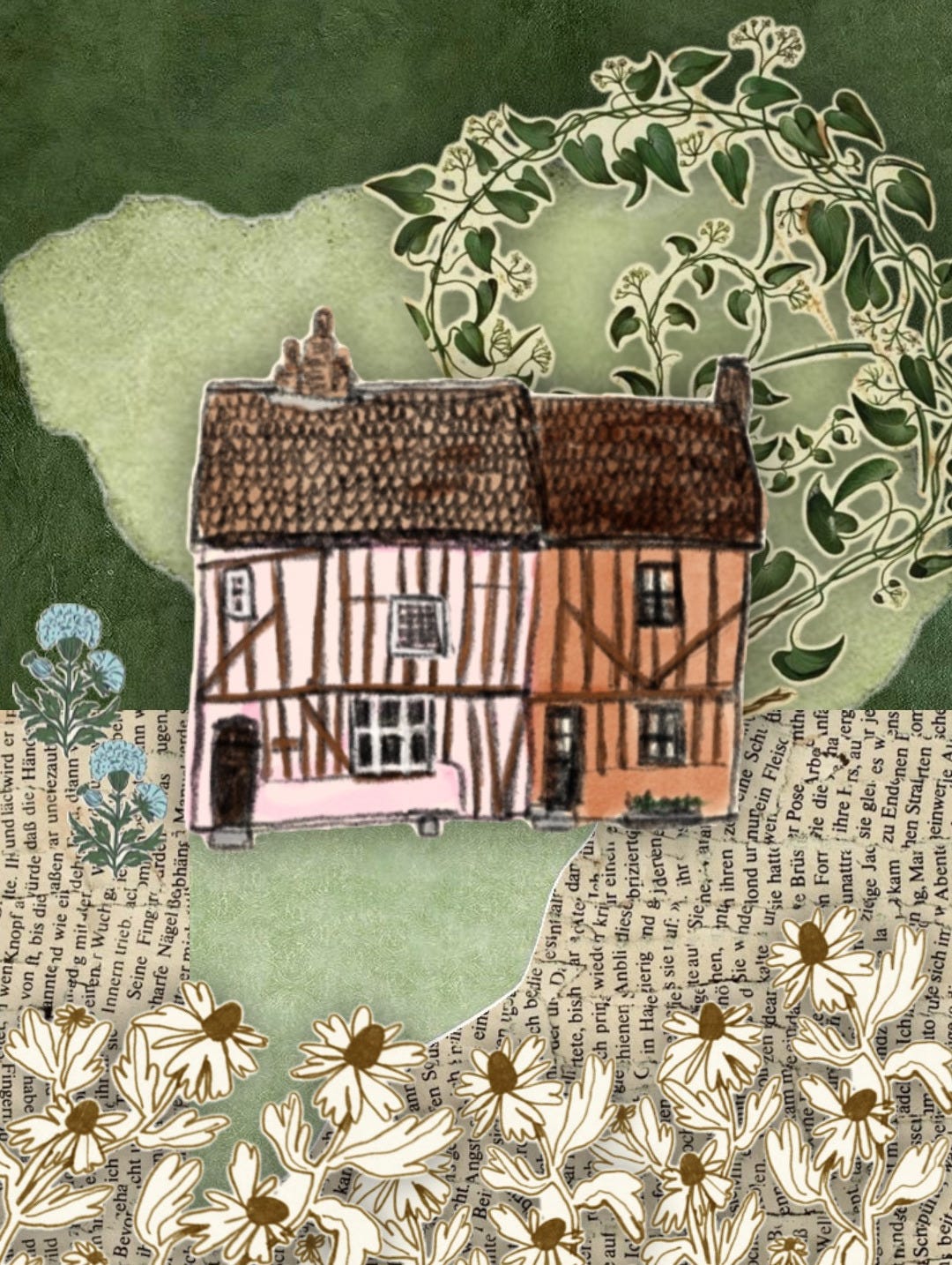 Hello, this isn’t my real name but I wish it was. I write things and make a variety of weird art and I’m haunted by my own antibodies, a state of affairs that often makes me very ill. Sometimes I can walk a lot, sometimes barely at all, and other times I hallucinate. If you’d like to know exactly which autoimmune disease I have, you’re in good company - my rheumatology team are still trying to figure it out! This is a newsletter where I write and draw about my life with my two partners Nettle and Dandelion. We live in a lopsided medieval hall house in a flat bit of England and we have two dogs. Aside from drawing and writing I also make a lot of very impractical jewellery, especially tiaras, and play several instruments badly. I am working on a novel about a bunch of haunted polyamorous weirdos who live in a castle in Scotland. I am not too sure about my gender and like to imagine it as someone just banging discordantly on a piano. I don’t use gendered pronouns for most of the characters in my newsletter because it’s my newsletter and no one can stop me.
